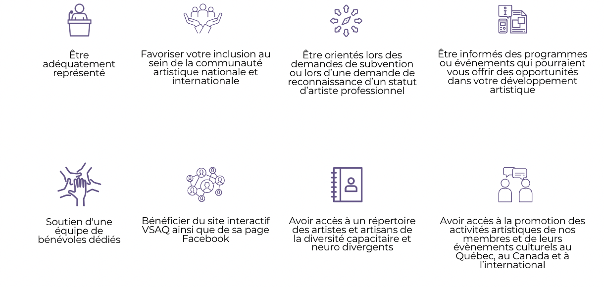 • Membre sympathisant : Toute personne qui ne fait pas partie de la diversité capacitaire ou neuro atypique et/ou ne pratique pas de discipline artistique, mais souhaite soutenir la mission de VSAQ.